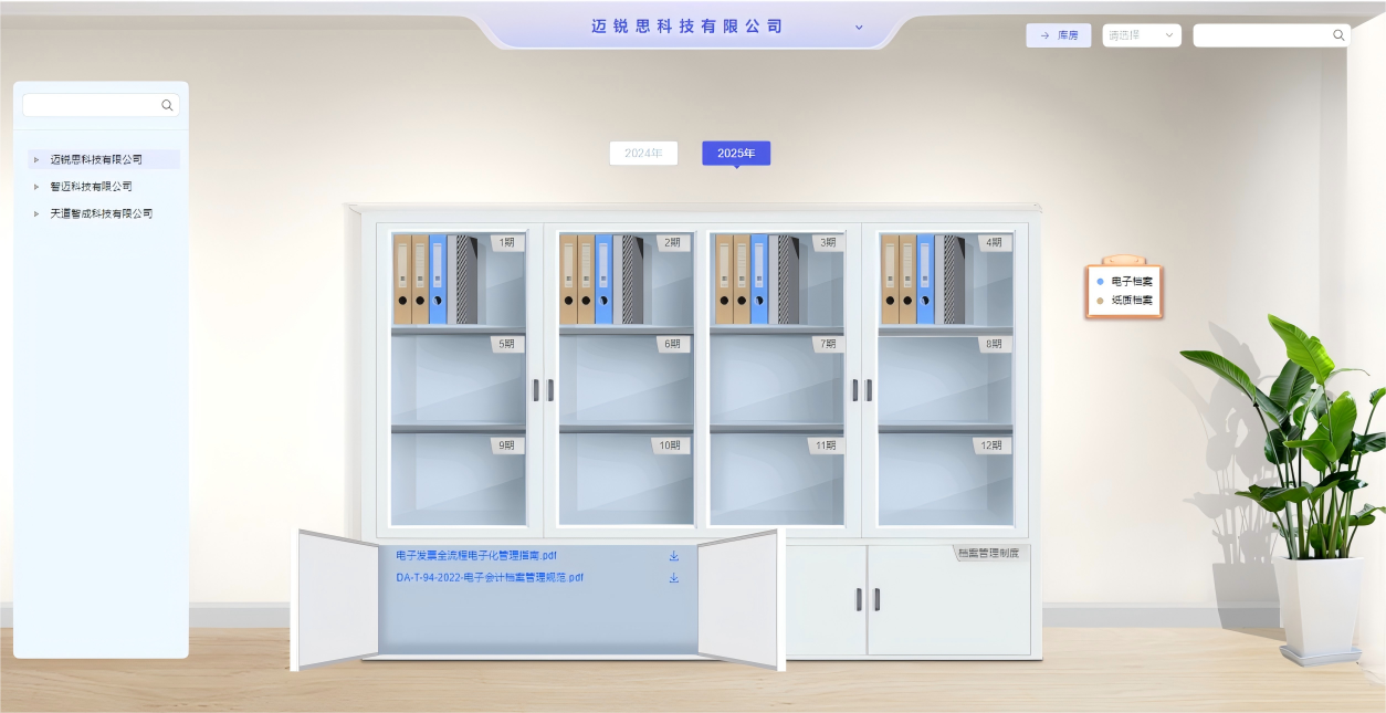 1.电子档案库,采用拟物化仿真设计,直观呈现;针对实体档案,亦有虚拟库房,与实体档案建联,满足现阶段双轨并行的管理要求。