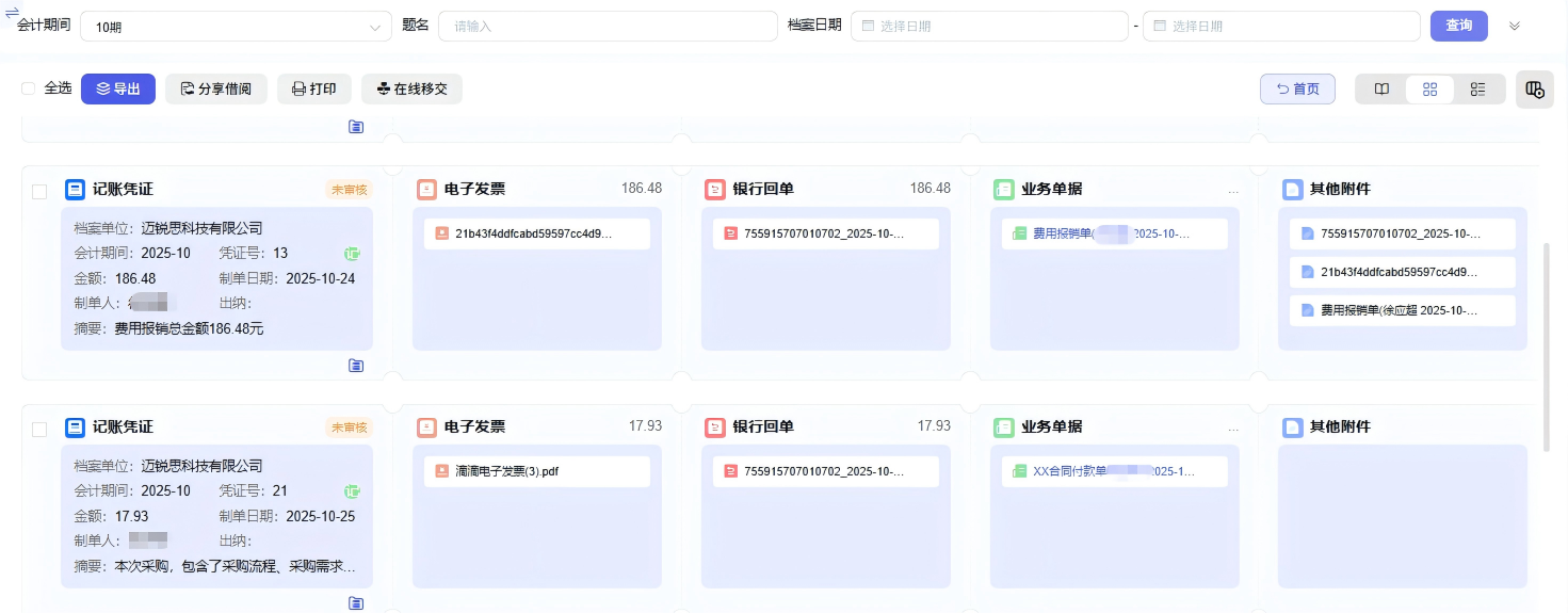 2.原始凭证与记账凭证关联入库,可从记账凭证追溯原始凭证或反向从原始凭证追溯至记账凭证,提供完整证据链,在审计或稽核时证明业务真实性和完整性;多维条件满足客户高频查询需求,支持关联打印和批量导出。